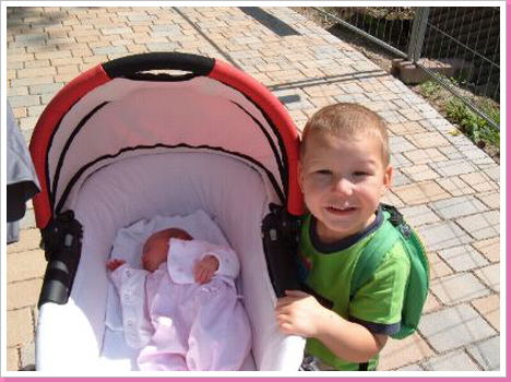 Stolz posiert mein Bruder an meinem Kinderwagen...